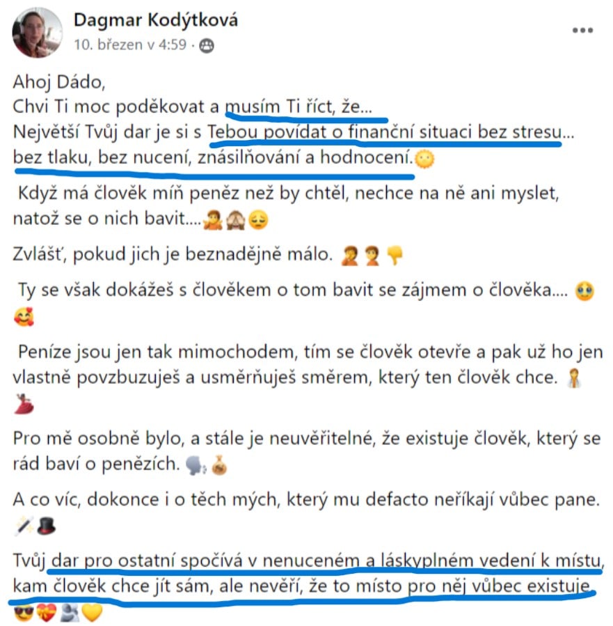 Hlavně mě na tom baví to, že to není brožurka klasického typu - univerzální a obecné a teoretické kecy v kleci , kde si po přečtení řekneš, ok, takhle chytrá jsem taky. Je na tom znát, že je to předání toho, co sama žiješ a děláš. A v naprosté lehkosti. Umím upéct skvělou bábovku a takhle ji dělám, zkus ji taky.... Jo, jasně, není to o bábovce 🙂 A taky to, co žiješ a sama děláš, že umíš předat srozumitelně dál. To je jako s tancem. Znám spousty skvělých tanečníků, ale málokdo naučí tančit. Jak jsem se cítila? Poprvé - jééé to je super, musím si to přečíst znovu víc v klidu. Teď podruhý: až tak jednoduché to je? Musím se soustředit, ať nepřeskakuju řádky :))))